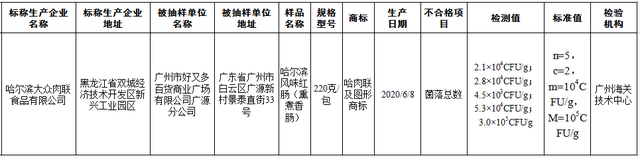 其中,广东省广州市好又多百货商业广场有限公司广源分公司销售的、标称黑龙江省哈尔滨大众肉联食品有限公司制造的哈尔滨风味红肠(熏煮香肠,哈肉联及图形商标,220克/包,生产日期:2020/6/8),菌落总数不符合食品安全国家标准规定。市场监管总局提示,《食品安全国家标准 熟肉制品》(GB 2726—2016)规定,熟肉制品(除发酵肉制品外)一个样品中菌落总数的5次检测结果均不得超过10万CFU/g,且至少3次检测结果不超过1万CFU/g。熟肉制品中菌落总数超标的原因,可能是企业未按要求严格控制生产加工过程的卫生条件,也可能与产品包装密封不严或储运条件不当等有关。